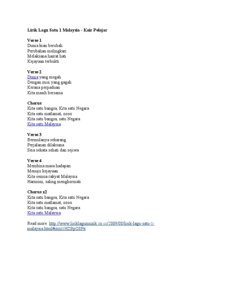 Kita semua rakyat malaysia harmoni, saling menghormati chorus x2 kita satu bangsa, kita satu negara kita satu matlamat, oooo kita satu . Shemy phat · song · 2017. Kita satu bangsa, kita satu negara kita satu matlamat, oooo. Lolfie__(@lolfie__), boss james(@bossjames_oe), naz dearie(@nazdearie), . Kita satu bangsa, kita satu negara. Kita semua rakyat malaysia harmoni, saling menghormati.